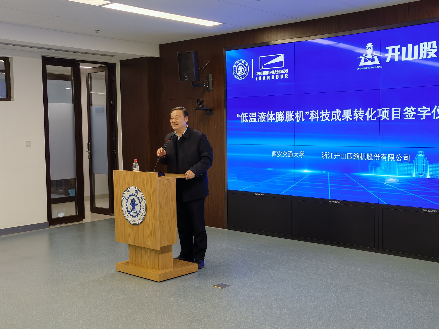 12月23日下午,在西安交通大學(xué)副校長王鐵軍和浙江開山壓縮機有限公司董事長曹克堅見證下,西安交大科研院常務(wù)副院長黃忠德與開山壓縮機公司副總經(jīng)理楊建軍分別代表雙方簽署“低溫液體膨脹機”科技成果轉(zhuǎn)化項目協(xié)議書。雙方將在西安交大創(chuàng)新港設(shè)立由開山股份控股的創(chuàng)新平臺公司——開山透平有限公司(KAISHAN TURBOMACHINERY CO.LTD.),旨在研發(fā)包括低溫液體膨脹機”在內(nèi)的透平機械產(chǎn)品。