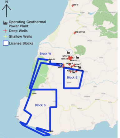 圖1:TTG的地?zé)衢_發(fā)準(zhǔn)證,其中藍(lán)色邊界線內(nèi)為準(zhǔn)證覆蓋區(qū)域(E區(qū)塊Transmark GPP項目所在地)。