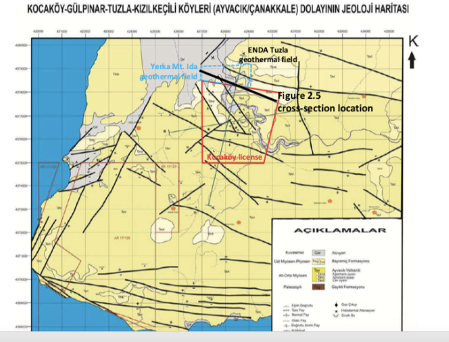 Transmark GPP項目位于Biga半島;北安塔利亞斷裂區(qū)南段、Kestanbol斷層系統(tǒng)的移動主導(dǎo)了區(qū)域內(nèi)由地?zé)峤Y(jié)構(gòu)控制的滲透性,建立深層、高溫的地?zé)崃黧w帶至淺層的熱循環(huán)。項目所在的恰納卡萊省有超過5個投運和開發(fā)中的地?zé)犴椖俊?/span>